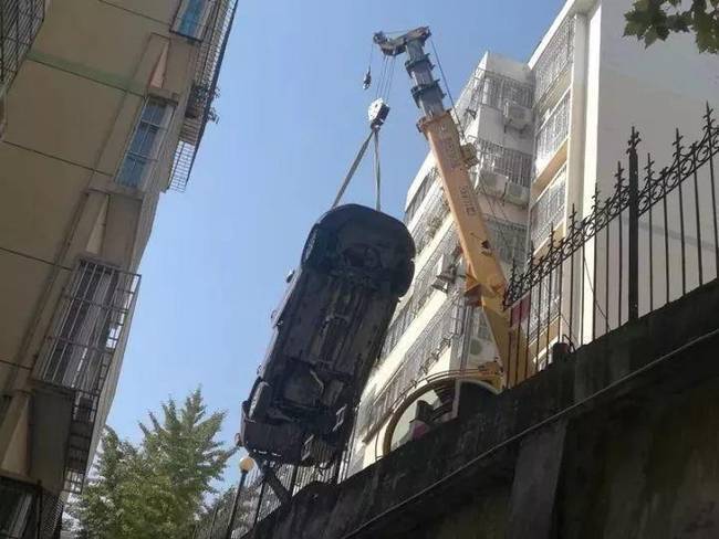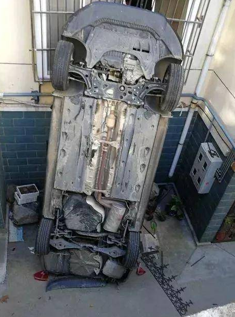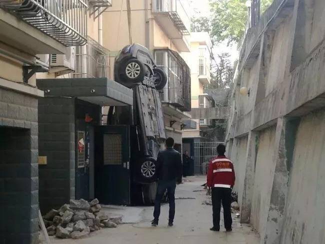 不仅仅是他们吓了一跳,就连居住在附近的陈先生说到这事儿也心有余悸。“昨天晚上10点40左右,我躺床上玩手机,突然听到一声巨响,以为地震了,赶紧跑出来。”陈先生告诉记者,他跑出来以后,发现一辆车“倒栽葱”一样立在温泉花园小区南侧的一处窗户上。“可能是倒车的时候,油门当做刹车了,下去之前还撞到上面台子停的一辆小车,然后直接倒冲下去了。”